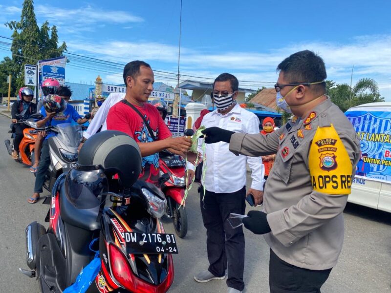 MEDIASINERGI.CO WAJO — Dalam rangka Operasi Keselamatan Lipu 2020, Sat Lantas Polres Wajo bersama PWI (persatuan Wartawan Indonesia) Kabupaten wajo melakukan giat sosial dengan membagikan 1.000 lembar masker secara gratis kepada seluruh Pengguna Jalan yang melintas di jalan Masjid Raya Sengkang Jumat, 17 April 2020.