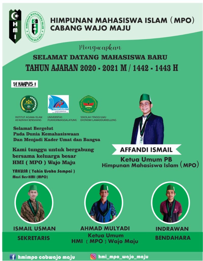 Ketua Cabang HMI Majelis Penyelamat Organisasi (MPO) Wajo Maju Ahmad Muliyadi mengucapkan dengan penuh rasa syukur dan kerendahan hati menyampaikan ucapan selamat datang kepada mahasiswa baru pada tiga kampus di Bumi Lamaddukelleng Tanah Bugis Sengkang.