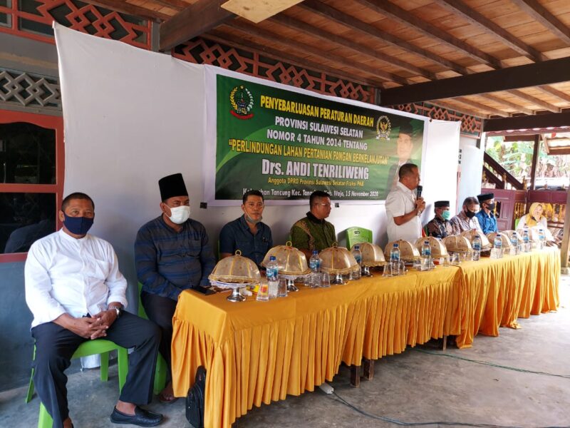 MEDIASINERGI.CO WAJO — Anggota DPRD Provinsi Sulawesi Selatan melakasanakan sosialialisasi Peraturan Daerah Nomor 4 Tahun 2014 tentang Perlindungan Lahan Pertanian Pangan Berkelanjutan di Kelurahan Tancung Kecamatan Tanasitolo Kabupaten Wajo, Minggu 15 Nopember 2020.