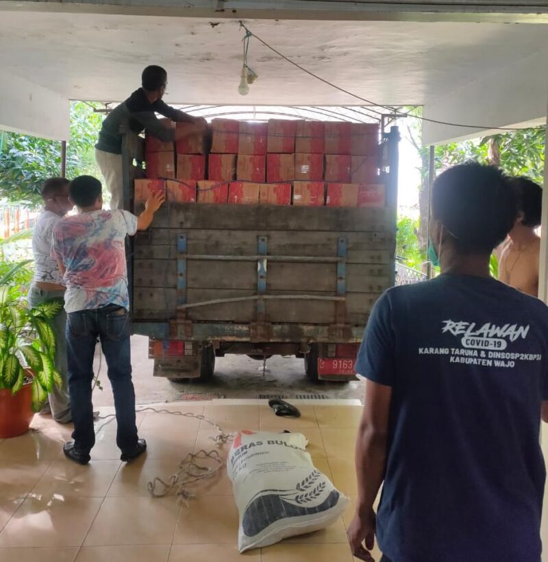 Paket bantuan didistribusikan dan diserahkan oleh Dinas Sosial Kabupaten Wajo dibantu relawan Karang Taruna Wajo melalui Camat se Kabupaten Wajo