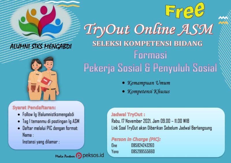 MEDIASINERGI.CO MAKASSAR — Alumni Sekolah Tinggi Kesejahteraan Sosial (STKS) Bandug dalam pengabdian kepada alumni, menginisiasi kegiatan Tryout Online secara gratis bagi para pejuang CPNS yang telah lulus pada ujian Seleksi Kompetensi Dasar (SKD) dan akan mempersiapkan diri dalam menghadapi tes Seleksi Kompetensi Bidang (SKB) pada formasi Pekerja Sosial dan Penyuluh Sosial.