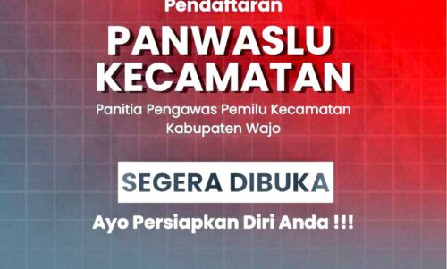 Kelompok Kerja Pembentukan Panwaslu Kecamatan Kabupaten Wajo di Badan Pengawas Pemilihan Republik Indonesia membuka kesempatan bagi Warga Negara Indonesia yang memenuhi persyaratan untuk mendaftarkan diri sebagai calon anggota Panwaslu Kecamatan yang dikutip https://wajo.bawaslu.go.id/