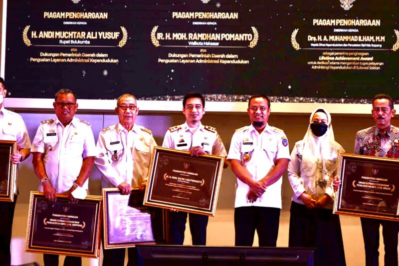 Penghargaan tersebut diberikan langsung oleh Gubernur Provinsi Sulsel, Andi Sudirman Sulaiman, dalam acara ‘Penghargaan Pencapaian Disdukcapil Provinsi Sulsel’ yang digelar di Hotel Claro, Rabu 14 Desember 2022.