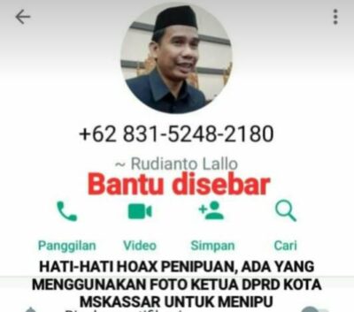 MEDIASINERGI.CO MAKASSAR — Masyarakat dihimbau mewaspadai maraknya aksi-aksi penipuan yang mengatasnamakan Ketua DPRD Kota Makassar Rudianto Lallo.