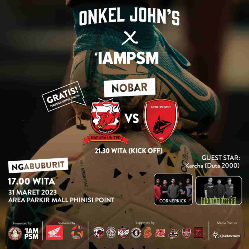 “Nobar ini berkat kerjasama antara Cafe Onkel John’s x IAMPSM dan aliansi kelompok suporter PSM yang di dukung oleh pihak Kepolisian Polrestabes Makassar dan Brimob Polda Sulsel,” ujar Muh. Al Fajri, Rabu 29 Maret 2023.
