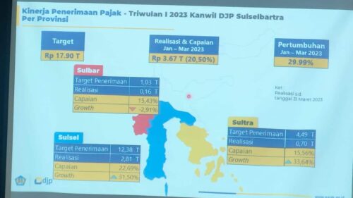 Pada Triwulan I Tahun 2023, Arridel Mindra mengatakan Kanwil DJP Sulselbartra berhasil mengumpulkan penerimaan pajak sebesar 3,67 Triliun atau 20,5% dari target penerimaan 2023 yang sebesar 17,9 Triliun.
