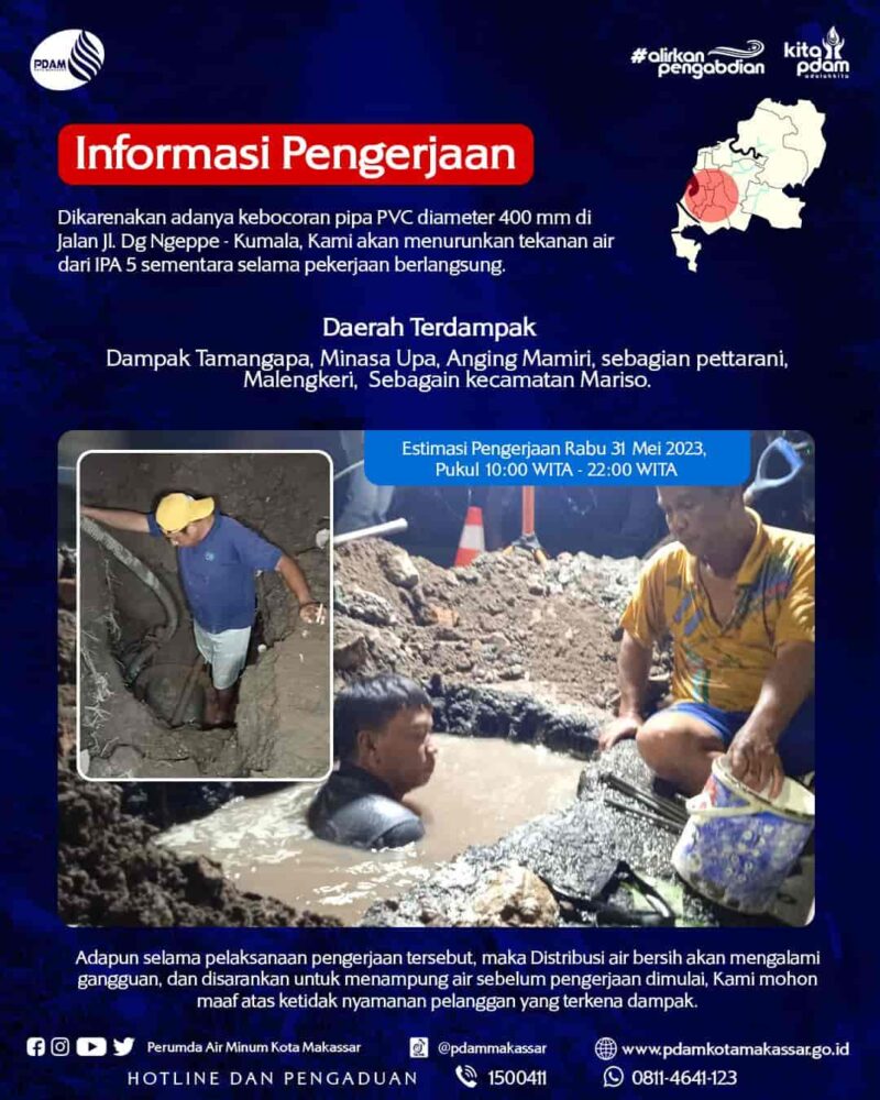 Menurut informasi dari PDAM Makassar, estimasi pengerjaan kebocoran pipa ini diprediksi akan berlangsung mulai pukul 10.00 – 22.00 WITA.