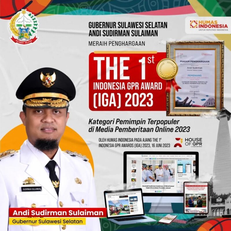 MEDIASINERGI.CO MAKASSAR — Gubernur Sulsel Andi Sudirman terpilih sebagai Pemimpin Terpopuler di Media Pemberitaan Online 2023 pada The 1st Indonesia GPR Awards (IGA) 2023 yang dilaksanakan oleh Humas Indonesia di Hotel Claro, Jumat, 16 Mei 2023.