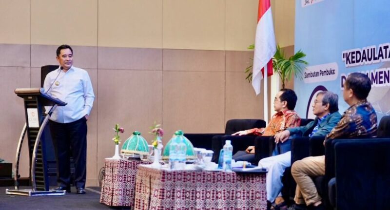 MEDIASINERGI.CO MAKASSAR — Penjabat Gubernur Sulsel, Bahtiar Baharuddin, memaparkan potensi alam di 24 kabupaten kota se-Sulsel, pada saat Rapat Kerja (Raker) Kedaulatan Maritim Sulsel dalam Mendukung Indonesia Emas 2045 yang digelar di Hotel Claro Makassar, Rabu, 20 Desember 2023.