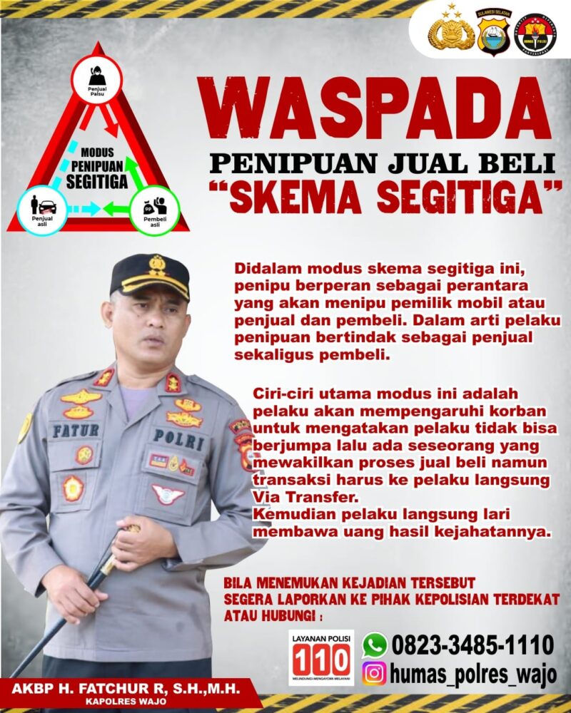 Menurut Kapolres Wajo pada kesempatan tersebut menyampaikan bahwa, didalam modus Penipuan skema Segitiga ini, Penipu akan berperan sebagai perantara yang menipu pemilik mobil atau penjual dan pembeli.