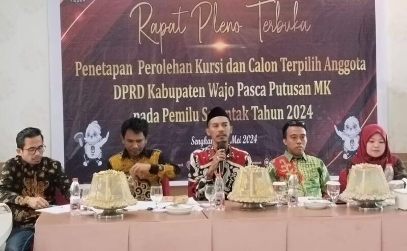 MEDIASINERGI.CO WAJO — Komisi Pemilihan Umum (KPU) Kabupaten Wajo menetapkan 40 Anggota DPRD Wajo terpilih periode 2024-2029. Penetapan tersebut melalui Rapat Pleno Terbuka Penetapan Perolehan Kursi dan Calon Terpilih Anggota DPRD Kabupaten Wajo pasca putusan MK Pada Pemilu Serentak 2024, Selasa 28/5/2024, di Aula Sallo Hotel, Jalan H. Bahe Sengkang.