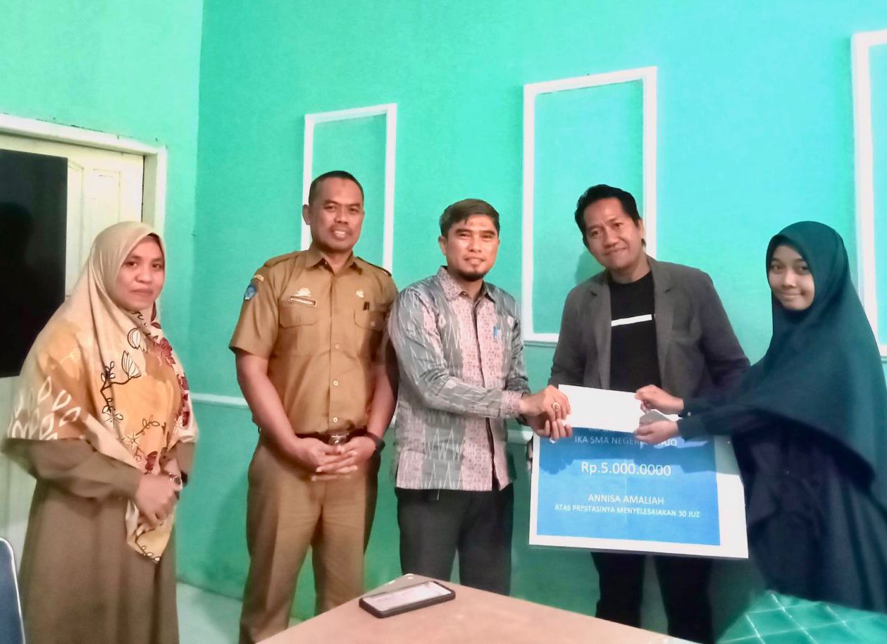 MEDIASINERGI.CO WAJO — IKA SMANPIT atau yang sekarang dikenal dengan UPT SMAN 6 Wajo Selawesi Selatan menyerahkan beasiswa pendidikan kepada Alumni Kelas Tahfiz Angkatan Pertama UPT SMAN 6 Wajo atas nama Annisa Amaliah putri dari pasangan Bapak Ustaz Rusdi, S.E dan Ibu Vera.