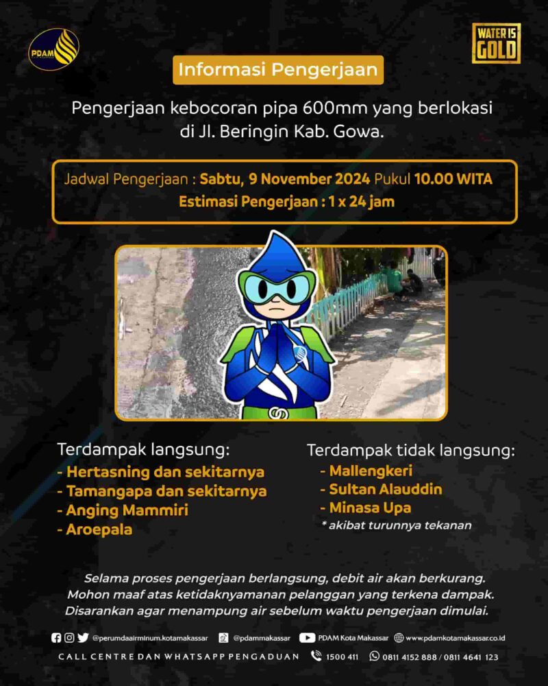 Rencananya, PDAM Makassar akan melakukan pengerjaan Sabtu (09/11/2024), pukul 10.00 Wita, dengan estimasi pengerjaan 1×24 jam.