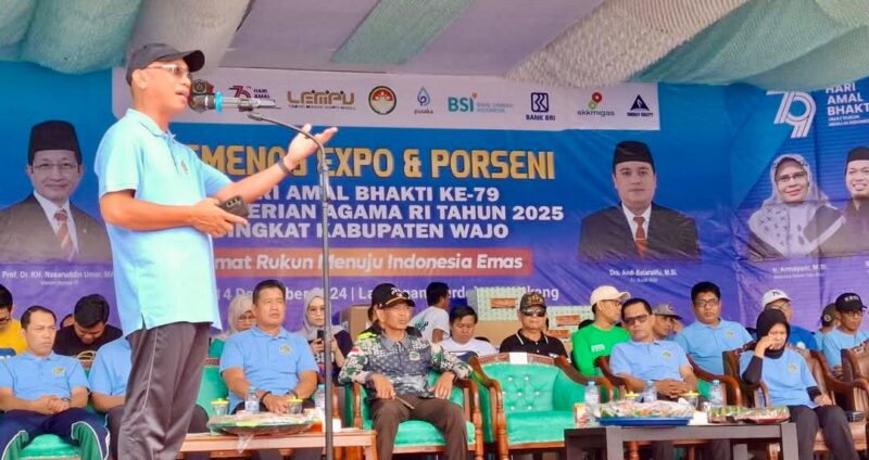 MEDIASINERGI.CO WAJO — Kementerian Agama Kabupaten Wajo resmi membuka rangkaian kegiatan Hari Amal Bakti (HAB) ke-79. Pembukaan kegiatan Hari Amal Bakti berlangsung di Lapangan Merdeka Sengkang, Rabu 11 Desember 2024, yang dihadiri langsung Kepala Kantor Wilayah Kemenag Provinsi Sulsel, H. Muh Tonang, Sekretaris Daerah Ir. Armayani, Forkopimda, mitra perbankan dari BSI dan BRI, Pimpinan Ormas, Pimpinan Pondok Pesantren dan tamu undangan lainnya.