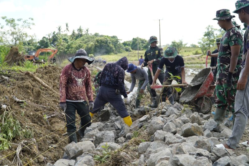 MEDIASINERGI.CO WAJO — Meski diterpa panas terik matahari, semangat personel Satgas TNI Manunggal Membangun Desa (TMMD) ke-124 Kodim 1406/Wajo tak surut dalam melanjutkan pembangunan talud di Desa Temmabarang, Kecamatan Penrang, Kabupaten Wajo. Proyek infrastruktur tersebut kini telah mencapai progres 85 persen.
