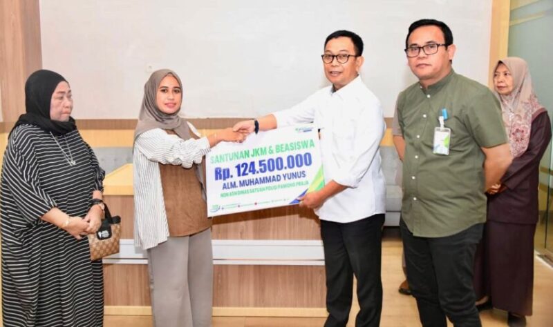 Acara dirangkai penyerahan santunan JKM kepada Ibu Elvina selaku isteri Almarhum Muhamamd Yunus Pegawai non ASN Dinas Satpol PP sebesar Rp124.500.000. Begitupula kepada Ibu Arifa isteri almarhum Langka pegawai non ASN Dinas PPK dan UKM menerima santunan JKM Rp42 juta.
